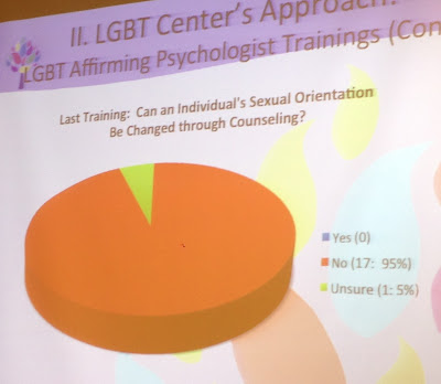 The presentation on China's LGBT mental health ended with sharing experience of how to resolve the existing problems in the trainings for psychologists and psychiatrists. One interesting note I withdrew from the cases: In an LGBT affirming psychologist training, they asked the same question before and after conducting the training, "Can an individual's sexual orientation be changed through counseling?". And here, you may take a look at how the percentage of answers have changed: